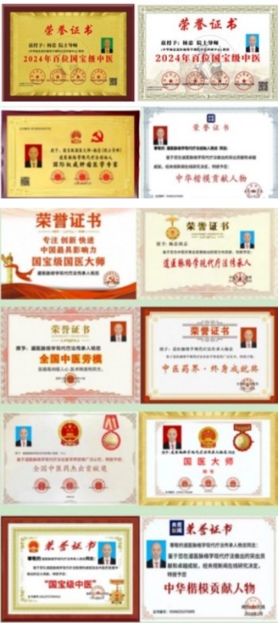 2024年8月授予“2024年百位国宝级中医”荣誉称号(中国中医名人网、全国人才技能认证管理中心、中国管理认证中心、中国卫生健康人才网)
