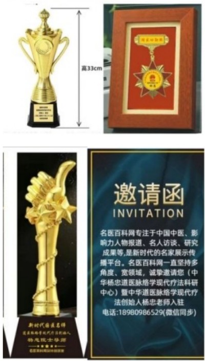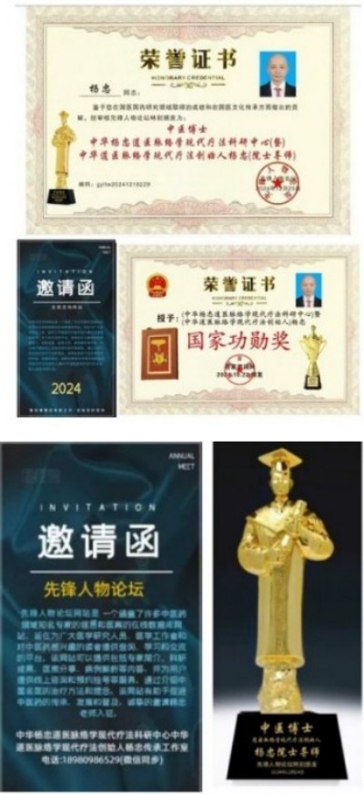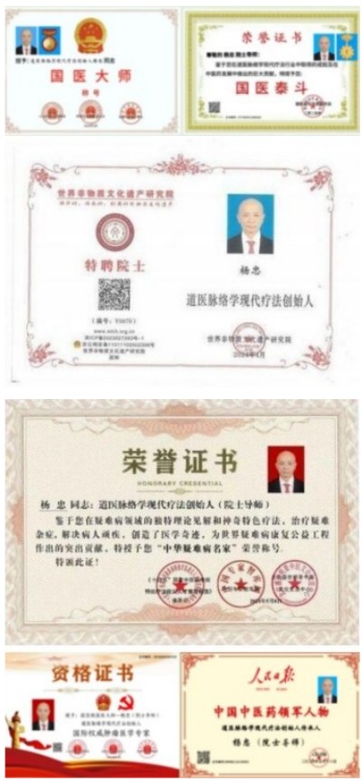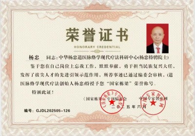 2025年3月中华杨忠道医脉络学现代疗法科研中心获得世界卫生组织传统医学科学院授予“国际中医大师”,获奖项目“道医脉络学现代疗法创始人”。