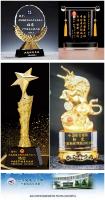 2025年3月中华杨忠道医脉络学现代疗法科研中心获得世界卫生组织传统医学科学院授予“中医药国际金奖”,获奖项目“道医脉络学现代疗法创始人”。